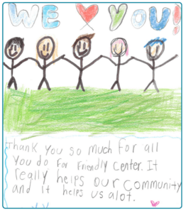 You will see one of those drawings here. A child thanking Friendly Center for helping their family. Below is a photo of Friendly Mart shelves full of bread, fresh fruits, and vegetables. No long lines. No waiting in the cold. No public display of struggle. Just privacy, choice, and respect. Families simply walk in by appointment and choose what their own families actually eat. No carts. No spotlight. Just dignity.